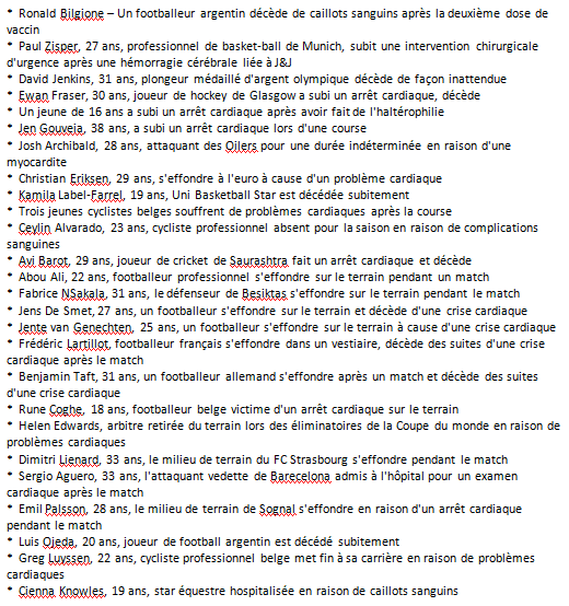 De plus en plus de citoyens s’émeuvent des blessures et des décès d’athlètes du monde entier suite à leur vaccination, et réalisent que ce qui est désormais visible et perceptible dans le monde du sport en raison de leur célébrité, est forcément un reflet de ce qui se passe également chez les anonymes, les » sans -dents » méprisés, les sans pouvoirs ignorés dont on ne parle pas et que nos autorités et les journaleux complices et corrompus considèrent comme quantité négligeable….