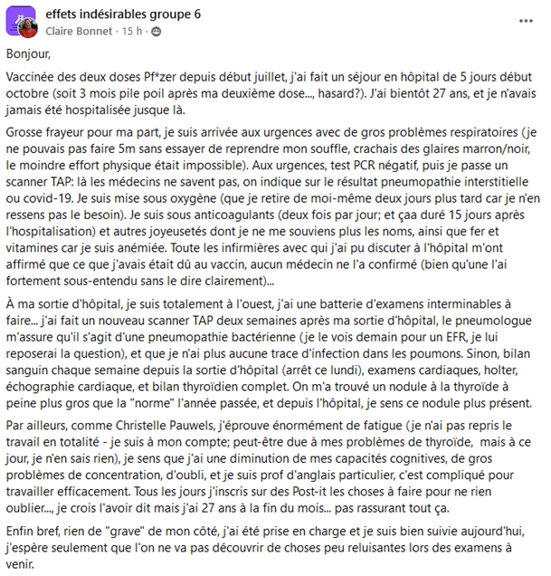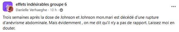 Cet article n’est constitué que de témoignages de personnes vaccinées et qui manifestement sont très mécontentes de leurs injections au point de refuser de faire la troisième, ou de personnes qui ne sont pas vaccinées mais qui sont confortées dans leur refus parce qu’elles sont témoins des effets graves sur leurs proches.