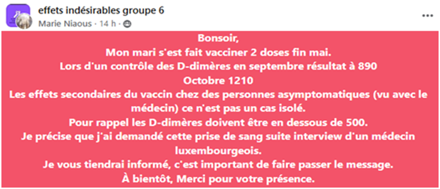 Cas n°1: vaccin fin mai, des D Dimères augmentées 4 mois après. Il ne s’est rien passé entre temps? Soyons sérieux, de plus si vous aviez fait une vraie recherche au lieu d’un copié collé absurde, vous auriez lu ça: https://www.rtbf.be/info/societe/detail_vaccins-contre-le-coronavirus-les-affirmations-trompeuses-d-un-medecin-sur-le-risque-de-thromboses-generalisees-liees-aux-d-dimeres?id=10858202 (« les D-dimères sont des marqueurs très peu spécifiques », car les causes d’une augmentation de ce taux de D-dimères dans le sang « sont multiples » : accident, chute, infection, inflammation, hémorroïdes, varices, thrombose, vaccin, mais aussi infection au Covid-19 peuvent entrainer une majoration du taux analysé ».)