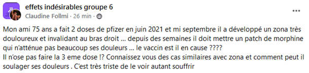 Cas n°6: des cas de zona sont notés en post vaccination, cependant, il faut rappeler que les personnes agées sont plus à risque de faire un zona, c’est pour cela qu’il existe un vaccin contre le zona remboursé dans cette tranche d’âge là.