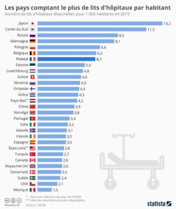 Alors que la France a longtemps pu se targuer d’avoir l’un des meilleurs systèmes de soins au monde, la comparaison internationale du nombre de lits d’hôpitaux sur le temps long permet de prendre conscience du plongeon qu’a connu la France depuis les années 80.