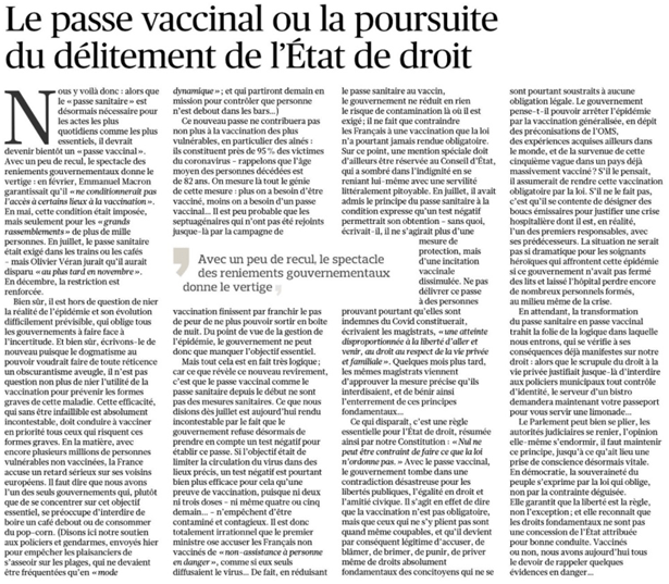 Dans mon article « Les antivax covid 19 sont-ils responsables de l’engorgement des hôpitaux et de la reprise épidémique ? », je vous signalais que des voix s’élèvent contre le projet de Loi transformant le pass sanitaire en pass vaccinal en cours de discussion à l’Assemblée nationale et que j’y consacrerais un nouvel article. Le voici. Je voulais attirer votre attention sur l’excellente tribune de François-Xavier Bellamy, intitulée «Le passe vaccinal ou la poursuite du délitement de l’État de droit», publiée le 28/12/2021 sur Le Figaro.