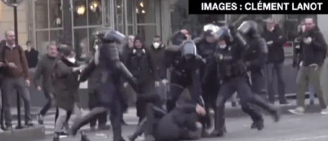 Beaucoup de violences policières sont perpétrées envers des citoyens français qui en ont assez de vivre dans l’état d’urgence permanent et qui veulent retrouver leurs libertés individuelles et leurs droits humains et citoyens fondamentaux inaliénables. Les manifestants qui arboraient le drapeau français se le sont vus arraché par les forces de l’ordre ou verbalisé ! Ci-dessous photo d’un journaliste identifié comme tel qui se fait arracher son matériel par un policier :