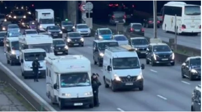 Ci-dessous des policiers tentent de bloquer le convoi de la liberté sur le périphérique