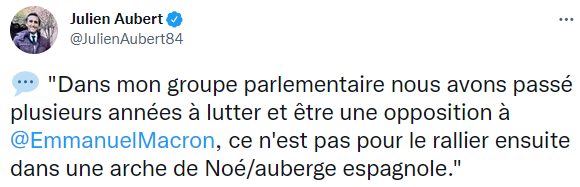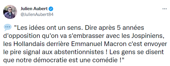 Concernant son vote au second tour, Julien Aubert affirme en son âme et conscience ce lundi matin qu’il « votera probablement blanc »   car  voter Macron, c’est endosser son bilan et être comptable pour le futur de ses actions.