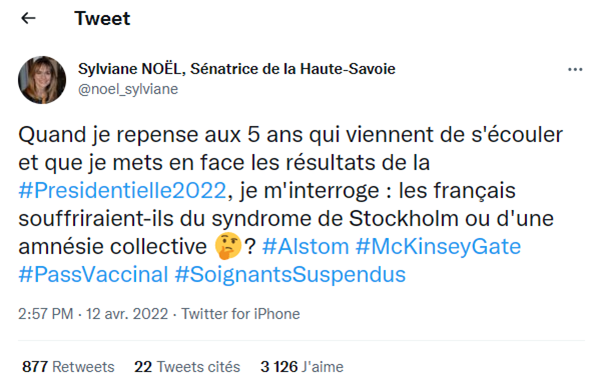 C’est l’analyse qu’en fait la sénatrice Sylviane Noël dans un tweet publié le 12 avril 2022 ! D’autres en commentaires font de l’humour en remarquant qu’il y a désormais plus de moutons en France qu’en nouvelle Zélande. Que de souffrances et de désillusions au cours de ce quinquennat durant lequel l’imposteur Jupitérien qui n’a rien de Jupiter a méprisé et maltraité les français !
