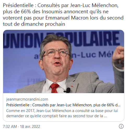 Ce score serait le résultat de la consultation de Mélenchon auprès de son électorat qui semble ne pas vouloir signer un chèque en blanc au président sortant … Rappelons que plus de 70% des électeurs ont désavoué Macron !   S’il était réélu,  la France devrait faire face à de nombreux mouvements sociaux et des contestations musclées….