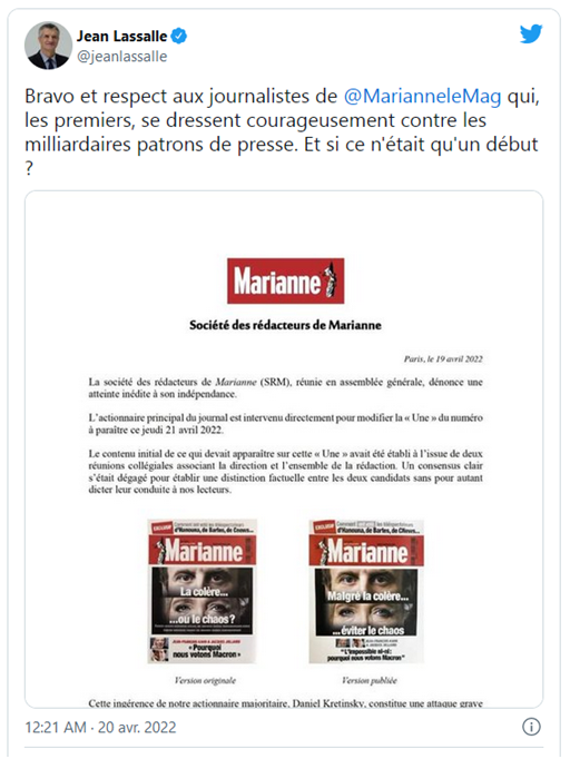 Publié le 21 avril 2022, dans Non classé, et tagué Fabrique du consentement, formatage de l'opinion publique, neutralité de la presse prise en défaut. Bookmarquez ce permalien. Poster un commentaire.