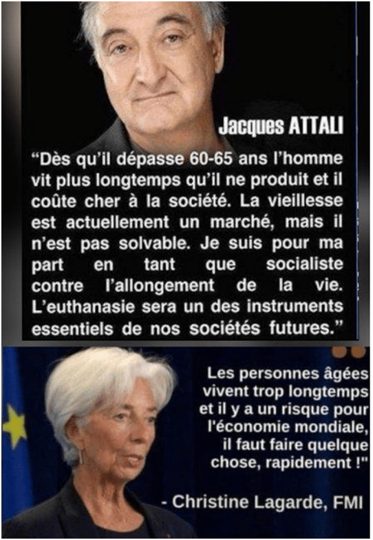 Que tous ceux qui ont dépassé les 60 ans  se portent volontaires pour se faire euthanasier, conformément aux souhaits de mort de ces fausses élites dévouées au diable et non à Dieu !  Les gros, les débiles mentaux, les individus au faible QI, les chômeurs, les handicapés, les  » inutiles   » devront-ils eux aussi accepter d’être euthanasiés pour laisser prospérer une société eugéniste qui n’a plus rien d’humaine ? Les propagateurs de cette doctrine immonde et véritablement diabolique sont les Bill  Gates, les Klaus Schwab,  les Jacques Attali,  les Rothschild,  les Rockefeller,  les Warren Buffett,  les Kissinger, les  Yuval Noah Harari,  les Christine Lagarde etc… qui font passer les profits  et l’économie avant les humains !