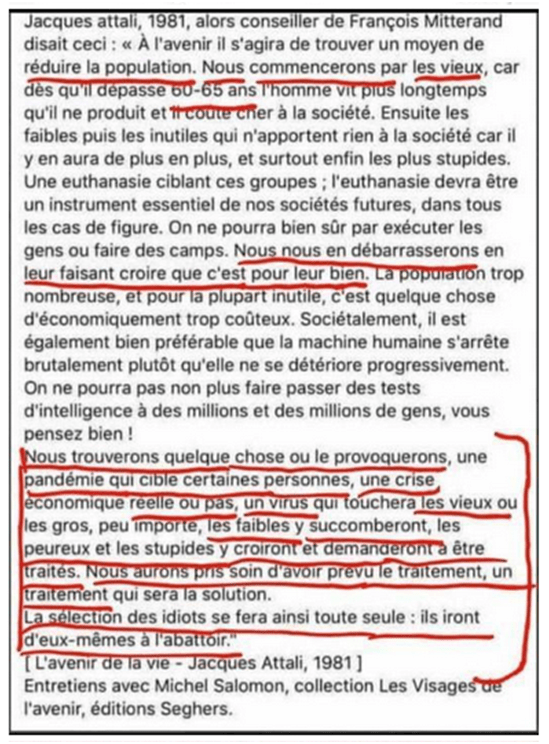 Les interviews et les écrits de Jacques Attali, entres autres,  ne trompent pas sur les objectifs poursuivis de dépopulation mondiale. Il est clair que la pandémie de Covid ( crée en laboratoire ) vient accélérer l’agenda morbide  destiné aux populations et que son faux remède achèvera le travail que le Covid n’a pas fait !  Allez-vous enfin regarder en face le sort qui nous est déjà réservé ou bien continuerez-vous à croire que tous ceux qui possèdent des pouvoirs sont bienveillants envers l’humanité  ?