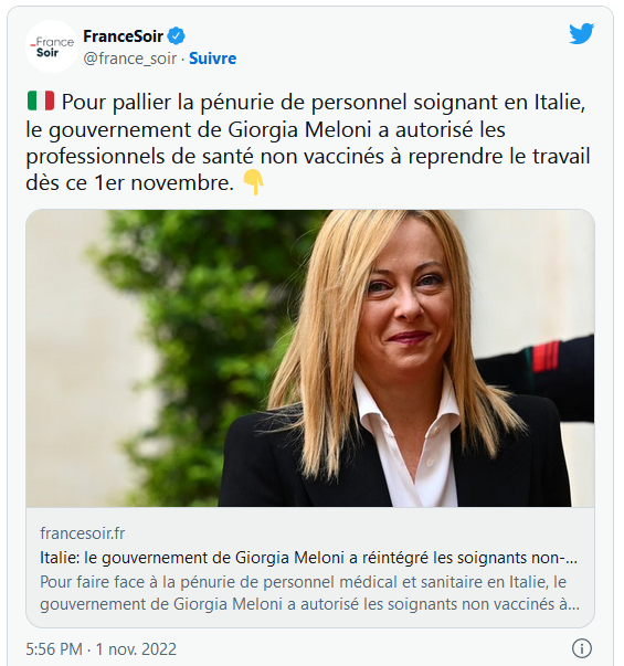 Pour pallier la pénurie de personnel soignant en Italie, le gouvernement de Giorgia Meloni a autorisé les professionnels de santé non vaccinés à reprendre le travail dès ce 1er novembre 2022