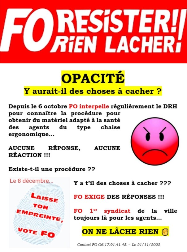 Force Ouvrière communaux d’Aulnay-sous-Bois critique l’opacité de la DRH concernant la fourniture de matériel