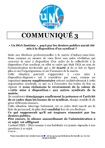 Suite aux élections professionnelles à la mairie d’Aulnay-sous-bois. Nous sommes en mesure de vous livrer une autre révélation qui concerne la mise à disposition d’un cadre de la collectivité à la disposition d’un syndicat, en effet ce cadre qui était DGA au sein de l’administration territoriale qui a été écarté et de ce fait ne figure plus ni sur l’organigramme ni sur l’annuaire de la mairie.