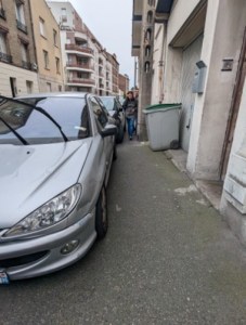 Stationnement interdit : entrée devant porte immeuble et passage trottoir difficiles.