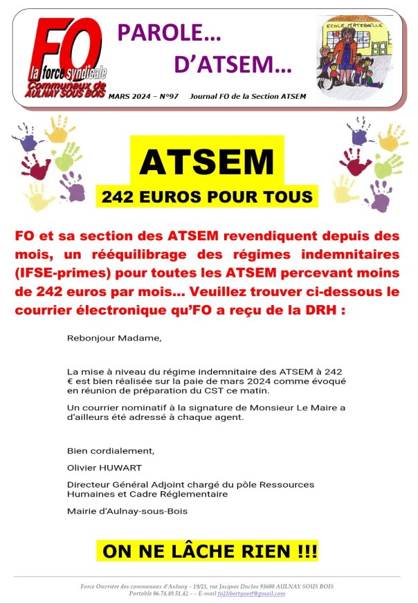 Force Ouvrière communaux d’Aulnay-sous-Bois défend les ATSEM