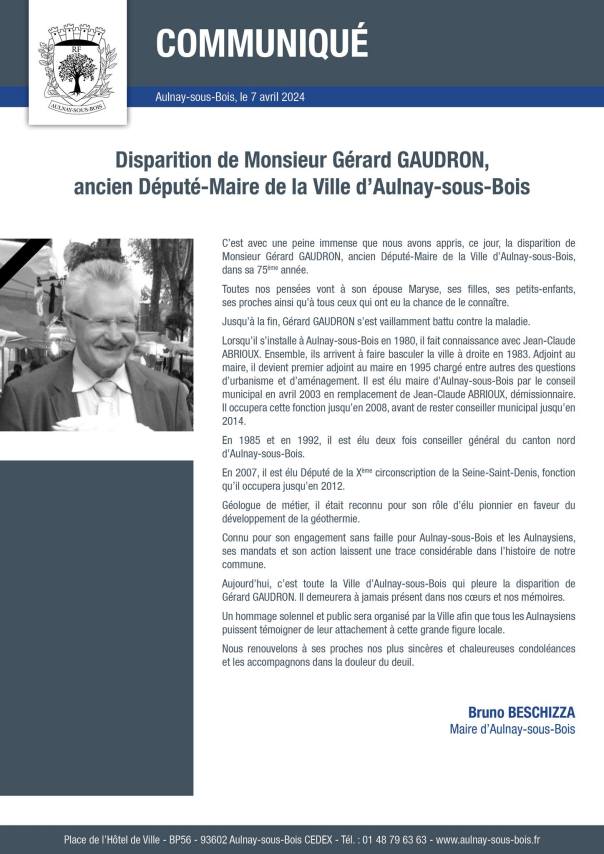 Nous apprenons la disparition de l’ancien Maire Gérard Gaudron, qui avait succédé à Jean-Claude Abrioux en 2003 et qui avait poursuivit son oeuvre. Ci-dessous le communiqué de la ville. Nous reviendrons très prochainement sur cette personnalité qui a marqué de son empreinte la ville d’Aulnay-sous-Bois.