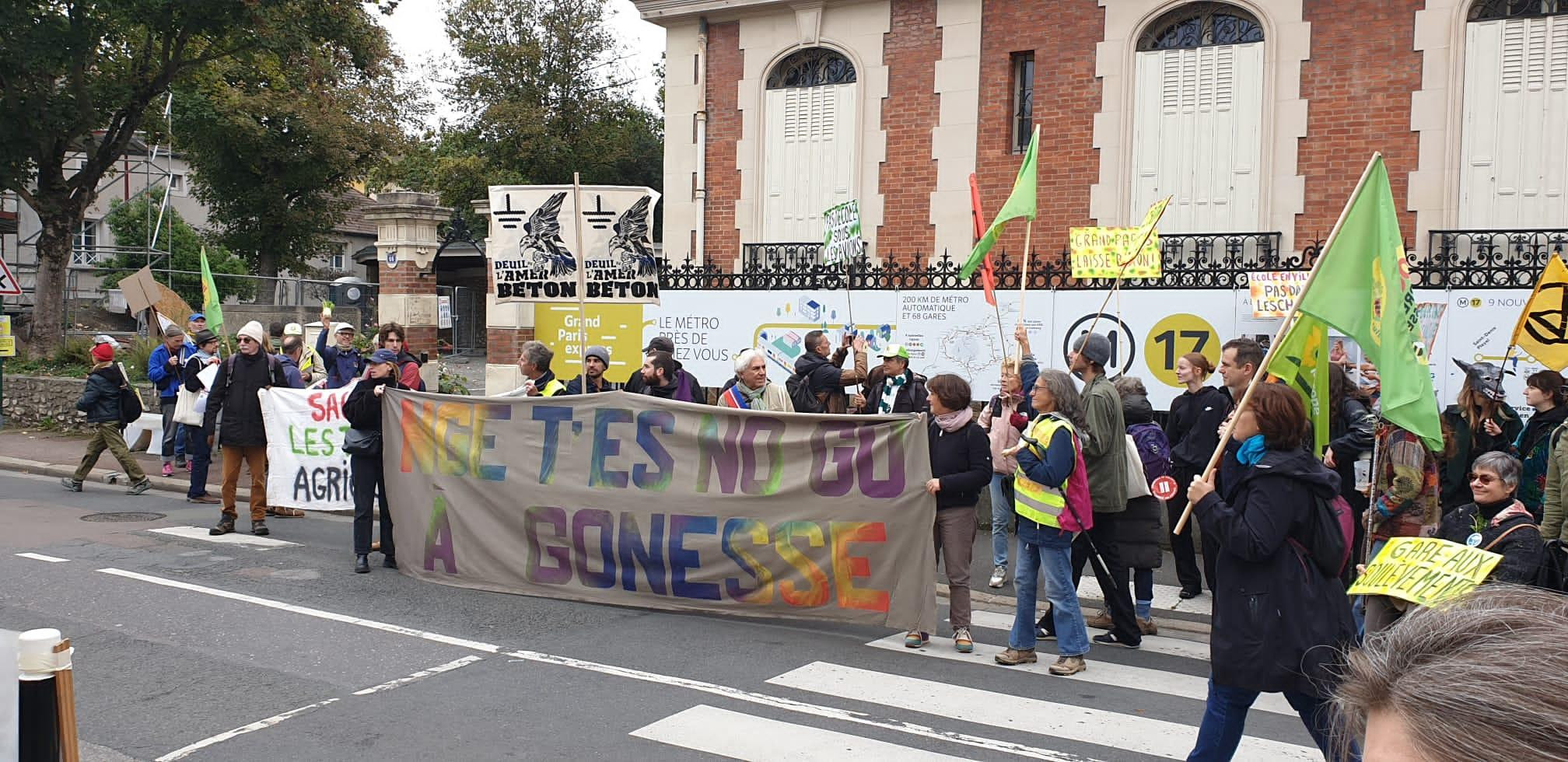 Sur le parcours, les manifestant·es ont marqué l’arrêt devant la mairie de Gonesse pour dénoncer la position du maire, Jean-Pierre Blazy, qui reste le plus grand défenseur de l’artificialisation des terres de la Zone d’Aménagement Concerté (ZAC) du Triangle. Pour ce faire, ils et elles se sont fait prendre en photo devant la mairie, les panneaux d’informations sur la ligne 17 et derrière une banderole sur laquelle on pouvait lire « NGE t’es No Go à Gonesse » en référence à la société NGE en charge de la construction de la ligne 17 et de l’A69. Dans le même temps, ils et elles brandissaient un légume qui symbolise leur volonté de voir les terres de Gonesse nourrir les habitants.