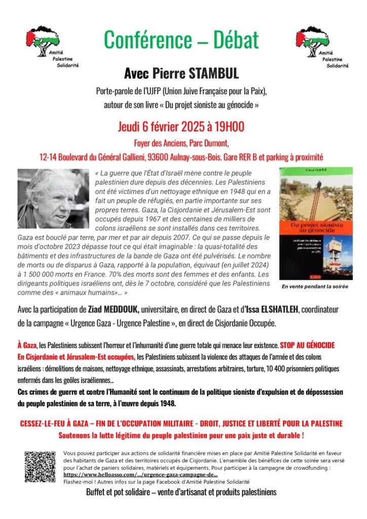 Le conflit au Proche-Orient vous intéresse ? Vous pouvez vous rendre au débat avec Pierre STAMBUL, porte-parole de l’UJFP (Union Juive Française pour la Paix), autour de son livre « Du projet sioniste au génocide ».