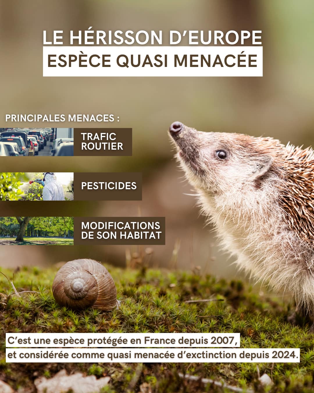 Le hérisson commun ou hérisson d’Europe est protégé depuis 2007 et est considéré comme « quasi menacé » d’extinction suite à la forte diminution de sa population sous les effets combinés du trafic routier, de la modification de son habitat ou encore de l’usage des pesticides.