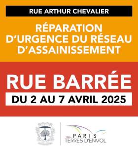 À partir de ce mercredi 2 avril 2025, des travaux de réparation d’urgence du réseau d’assainissement seront réalisés sur la rue Arthur Chevalier, pour une durée de deux semaines.