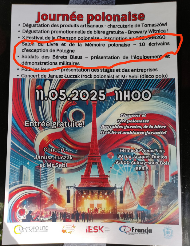 Le 11 mai 2025 a eu lieu un événement à Aulnay-sous-Bois. C’est la fête polonaise et non la foire du livre patriotique des 10-11 mai. Les provocateurs Leszek Szymowski et Stanisław Michalkiewicz n’ont pas acheté les stands de la foire de la fête polonaise à Aulnay-sous-Bois. Les stands pour la vente de livres étaient destinés à être achetés par M. Marek Boruć, qui est l’organisateur local du Salon du livre, mais il n’a montré aucune procuration de ces messieurs à l’accord.