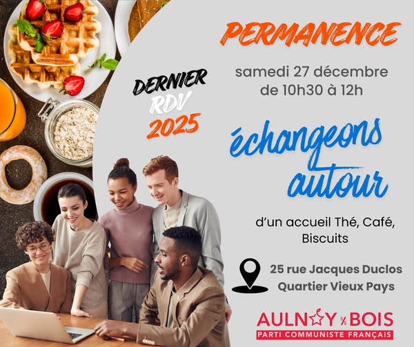 Nous vous donnons rendez-vous pour la dernière permanence de l’année 2025, le samedi 27 décembre, de 10h30 à 12h, 25 rue Jacques Duclos – Quartier Vieux-Pays
