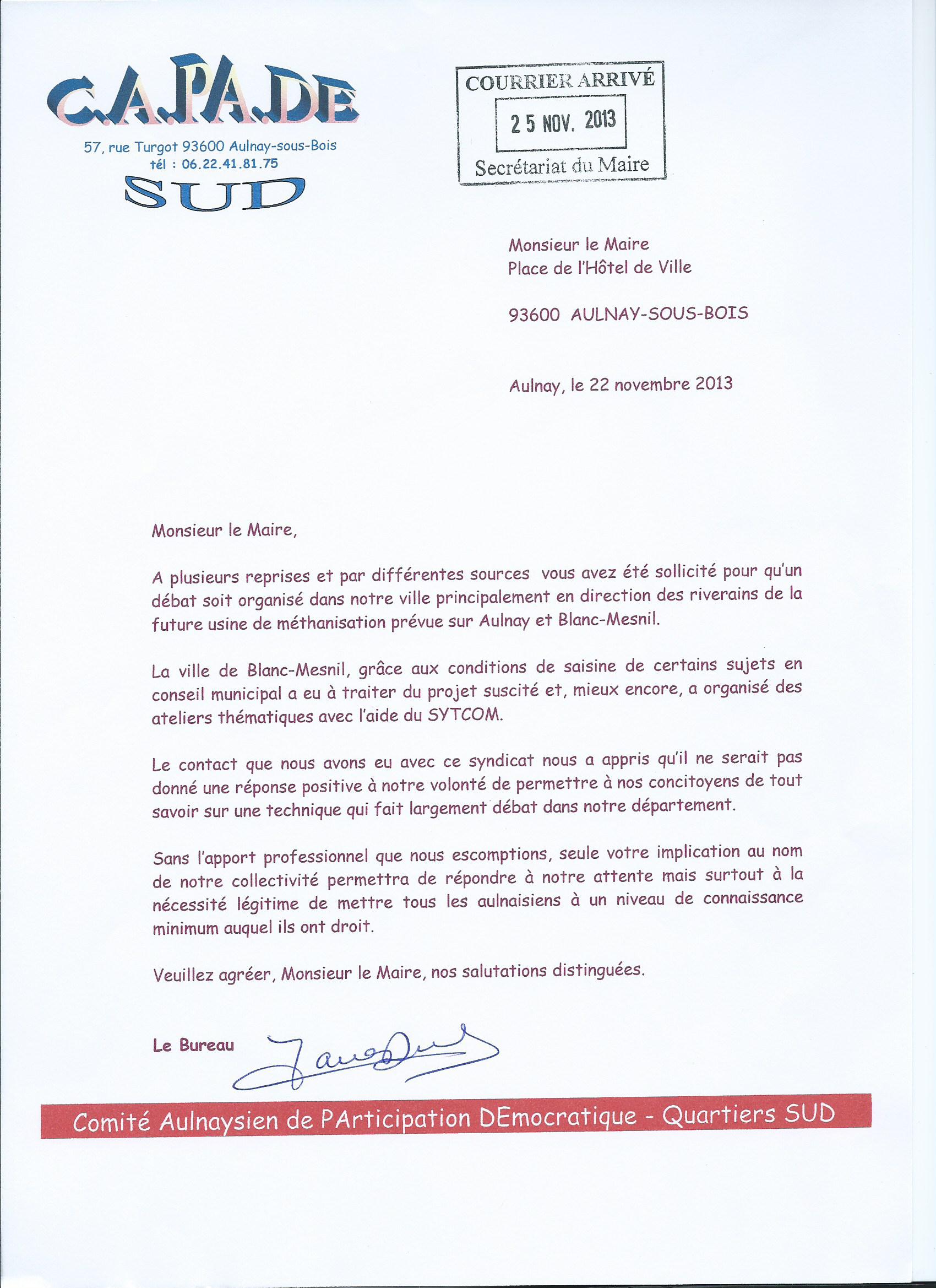 En espérant une prise en compte de la présente demande, nous vous prions de croire, Monsieur le Maire, à notre parfaite considération.