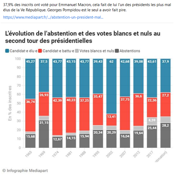 Mathilde Goanec : » Avec 28 % d’abstention, le second tour de la présidentielle a tenu sa promesse : mobiliser encore moins que le premier. Le nombre de votes blancs est peu ou prou celui de 2017, mais triple par rapport au 10 avril 2022. Macron a promis de prendre en considération le « silence » des électeurs. «