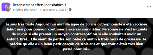 Les fœtus en cours de formation dans le ventre de leur mère subissent également les effets toxiques des injections prodiguées à leurs parents…. Ci-dessous d »autres témoignages sur le thème thème des fausses couches et des avortements thérapeutiques engendrés par les injections :