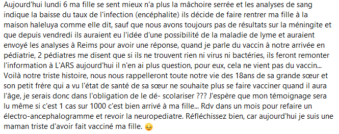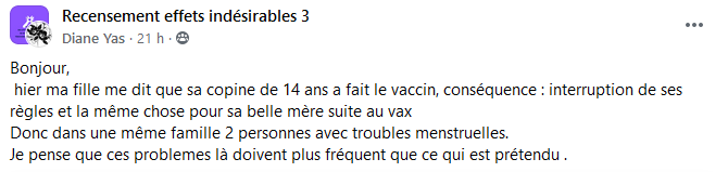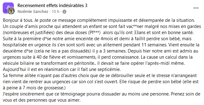 Est-il nécessaire de vous préciser que sur les centaines de témoignages postés chaque jour, je n’en capture que quelques uns donnant un panorama le plus exhaustif possible des dérèglements sanitaires qui surviennet après la vaccination ? Pourquoi les médias écrits et télévisuels n’en parlent jamais ? Cet omerta est inadmissible et scandaleuse et je la dénonce haut et fort !