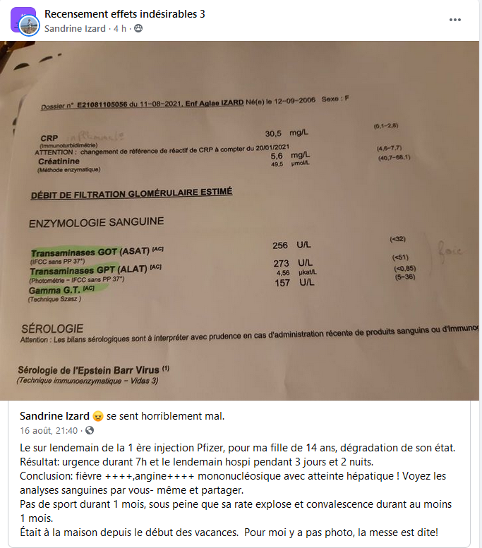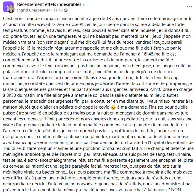 Est-il nécessaire de vous préciser que sur les centaines de témoignages postés chaque jour, je n’en capture que quelques uns donnant un panorama le plus exhaustif possible des dérèglements sanitaires qui surviennet après la vaccination ? Pourquoi les médias écrits et télévisuels n’en parlent jamais ? Cet omerta est inadmissible et scandaleuse et je la dénonce haut et fort !