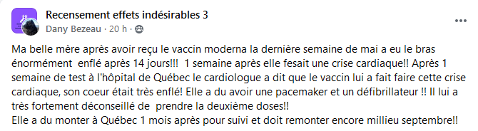 Puisque l’humanité qui gobe la propagande rassurante et mensongère du gouvernement, est tenue à l’écart des incroyables effets indésirables de ces vaccins, je relayerai quelques uns de ces vécus préoccupants tellement nombreux qu’il est impossible de tous les publier !