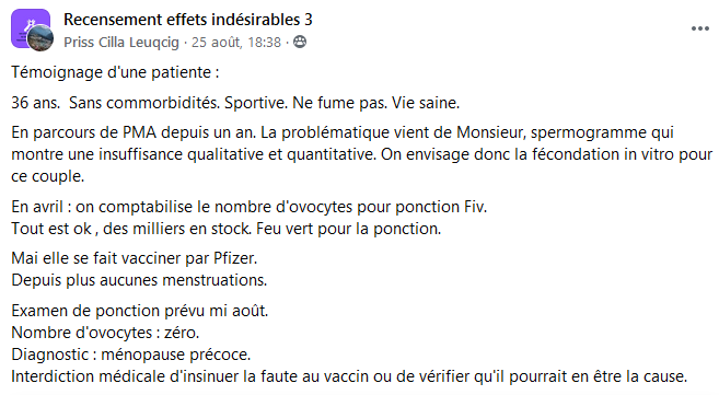 Je rappelle au lectorat avoir lu de nombreux témoignages de femmes sur les différents groupes Facebook recueillant les témoignages d’effets indésirables provoqués par les injections, qui s’inquiètent du dérèglement absolu de leurs menstruations : certaines n’ont plus de règles, d’autres en ont trois fois dans le mois, d’autres encore disent qu’elles sont hémorragiques, et enfin des femmes qui étaient ménopausées se mettent de nouveau à avoir des règles ! Il est tout de même étonnant que le corps médical réagisse en affirmant que ces phénomènes sont tout à fait normaux ou non liés aux injections ! Qu’en savent-ils ? Pourquoi ce déni ?