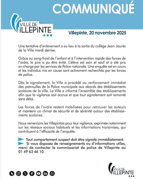 Un incident survenu mardi à la sortie du collège Jean-Jaurès, à Villepinte (Seine-Saint-Denis), suscite une vive préoccupation dans l’ensemble du secteur. La Ville a confirmé, mercredi, qu’une tentative d’enlèvement avait été signalée auprès des forces de police, déclenchant un renforcement immédiat des patrouilles autour des établissements scolaires.