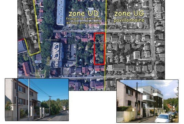 « Défense de la zone pavillonnaire », nous avait-on promis. Mais les promesses ne valent que pour les naïfs qui veulent y croire. Un nouveau projet immobilier est apparu au milieu d’une zone qu’on pourrait penser pavillonnaire, puisqu’en effet, on n’y voit que des pavillons, et surtout leurs précieux jardins. C’est sans compter sur les surprises du zonage, dont il faut rappeler qu’il n’a jamais été soumis à concertation dans le nouveau PLU de 2015. Une concertation – rideau de fumée, car l’essentiel, le règlement de chaque zone est également resté à la seule discrétion du pouvoir municipal. C’est ainsi qu’une vaste zone UD autour des « axes structurants » est accessible à la construction d’immeubles de 3 étages. On ne peut donc rien opposer à la construction de gros pavés collectifs au milieu du tissu pavillonnaire, comme ici, un immeuble de 14 logements au 14 rue de Belfort.