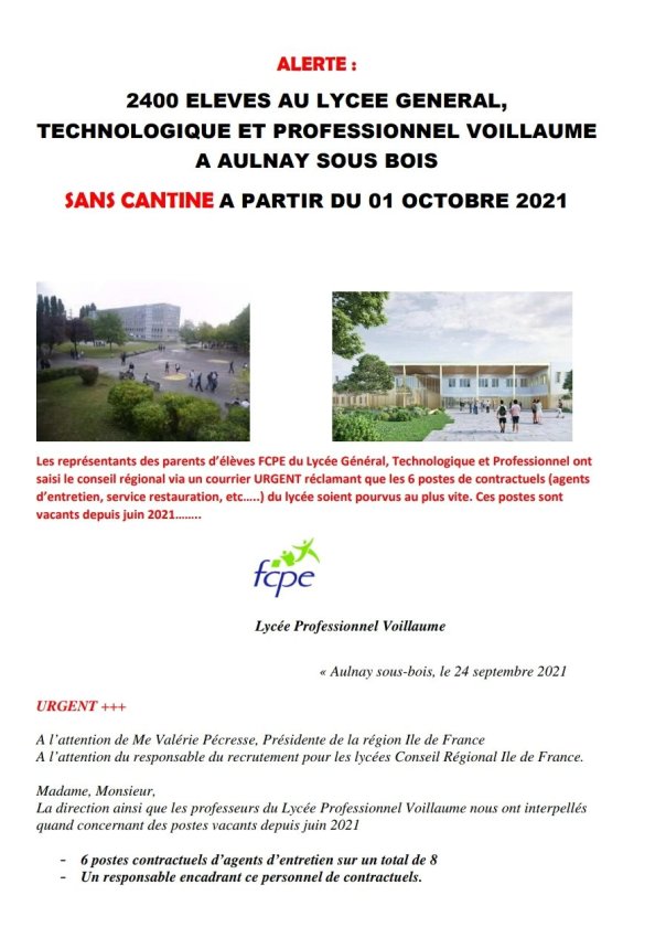 Le 24 septembre dernier, les représentants des parents FCPE du Lycée Général et Professionnel Voillaume d’Aulnay sous Bois, confrontés à des dysfonctionnements qui perdurent sans que des solutions y soient apportées pour y remédier, ont saisi en urgence le Conseil Régional via un courrier réclamant qu’au minimum les 6 postes de contractuels laissés vacants soient pourvus au plus vite.