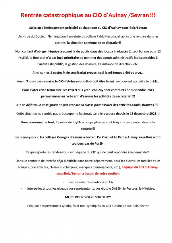 s représentants de parents d’élèves, des parents, des aulnaysiens, des élus de gauche se sont mobilisés en réclamant au conseiller régional d’Ile de France Bruno Beschizza et à Valérie Pécresse, Présidente de la Région Ile de France, des mesures urgentes pour que les élèves puissent étudier dans de bonnes conditions et que les enseignants puissent exercer dans des conditions satisfaisantes.