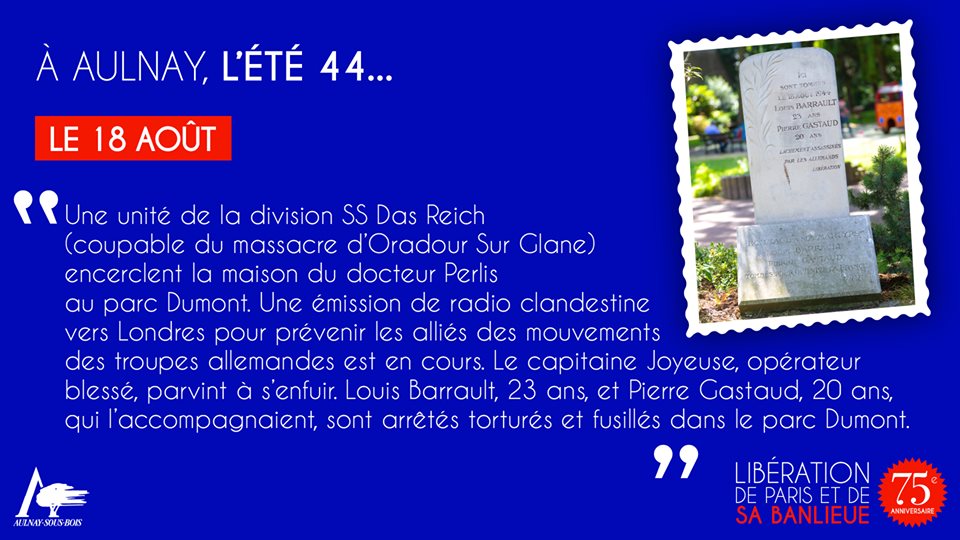 Le 18 août, la maison du docteur Perlis est soudainement encerclée dans le parc Dumont. Louis Barrault et Pierre Gastaud, deux jeunes aulnaysiens âgés de 23 et 20 ans, sont arrêtés, torturés et fusillés. De nos jours, une stèle leur rend hommage