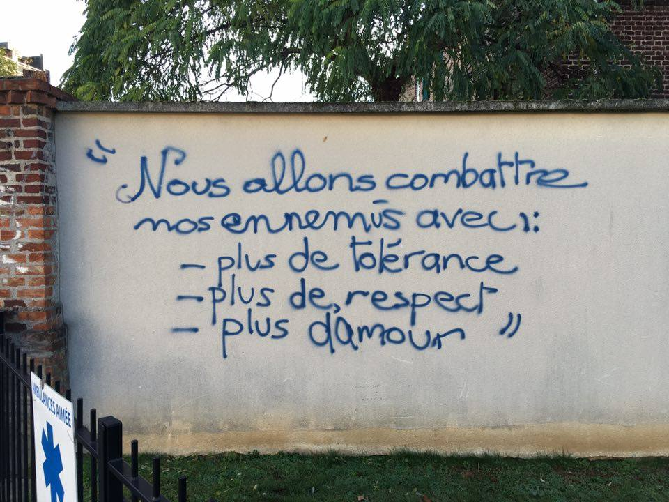 Quelques jours après, c’est un autre message qui appelle à plus de tolérance par rapport aux messages inscrits sur les murs. Une sorte de résistance vis-à-vis de la barbarie ?
