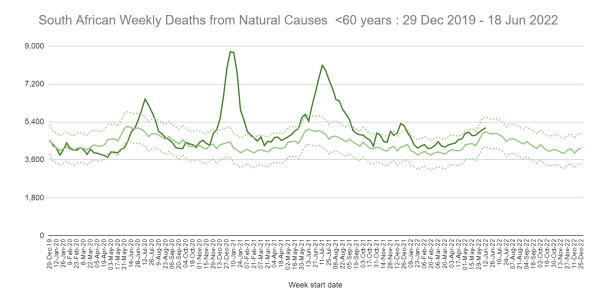 Evolution décès en Afrique du sud des moins de 60 ans. Les traits en pointillés correspondent aux projections basses et hautes. Le trait vert clair ce à quoi s’attendait les démographes