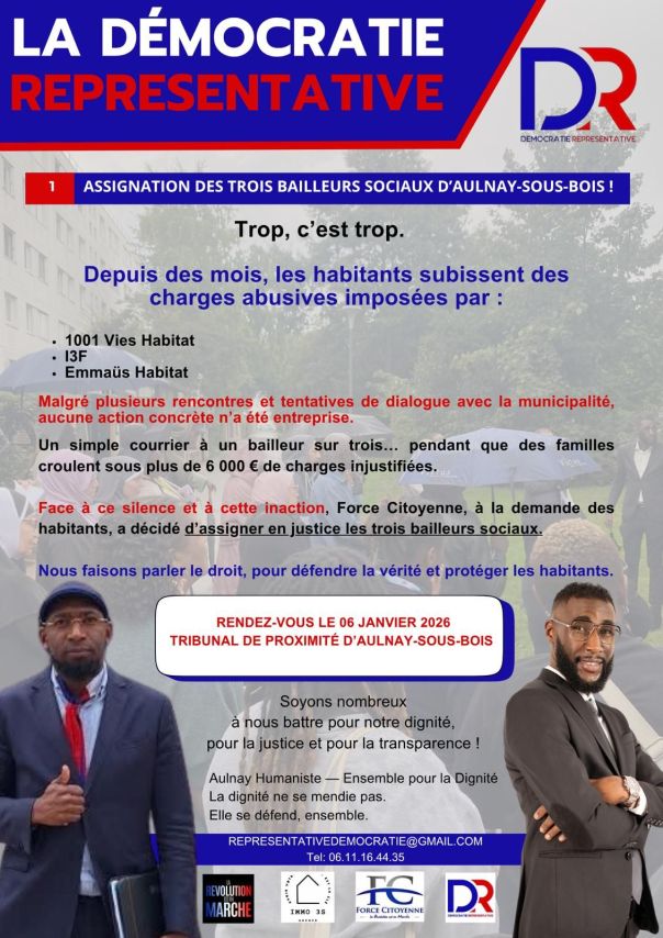 Le 6 Janvier 2026, à 9h30, l’association Force Citoyenne du mouvement LREEM, va écrire l’histoire des quartiers Nord de la ville d’Aulnay-sous-Bois. En effet, au nom de la majorité silencieuse, l’association Force Citoyenne a assigné les bailleurs :