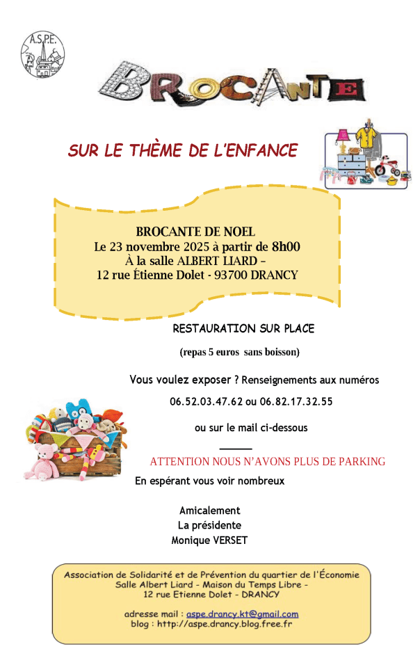 L’Association de Solidarité et de Prévention du quartier de l’Economie (ASPE) de Drancy vous convie à une BROCANTE DE NOEL le 23 novembre 2025 à partir de 8h00.