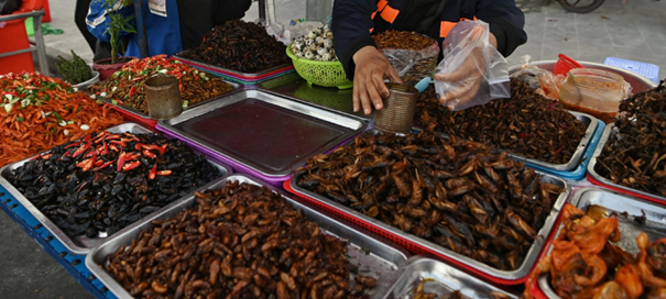 Ci-dessus image d’un étal de marchand de Grillons cuits et autres insectes à Phnom Penh au Cambodge