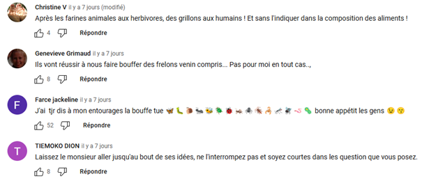A en croire les commentaires sous les vidéos youtube qui traitent de ce sujet ou sous les publications Facebook, Beaucoup sont consternés que la commission européenne force implicitement la population européenne dont ce n’est pas la tradition gastronomique à consommer ces larves et ces insectes, parfois sans avoir la garantie que ces farines et poudres soient mentionnées dans la liste des ingrédients. On sent nettement derrière cette préoccupation la volonté très nette de ne pas consommer ces produits et la colère inhérente à l’obligation implicite qui est faite de les consommer malgré soi et contre sa volonté éclairée.