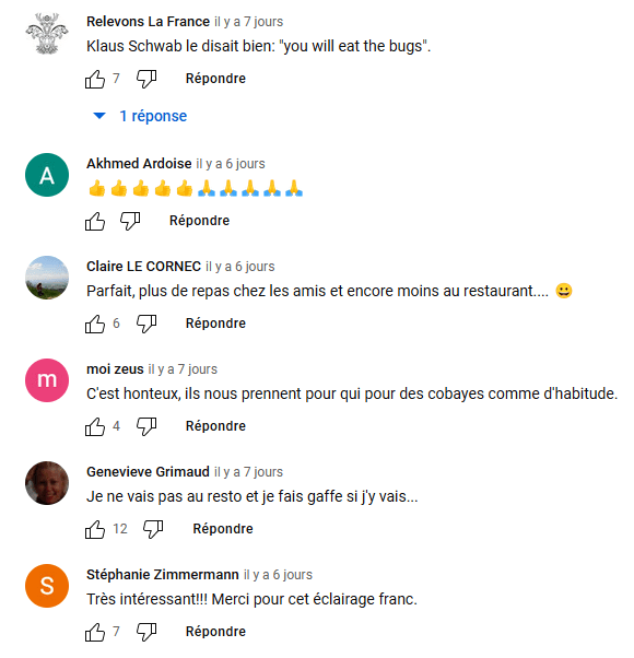 Vous verrez que peu de gens apprécient ces nouveaux aliments imposés…. Il est regrettable que seuls, les gens de droite s’en émeuvent et que les autres obédiences politiques se taisent sur le sujet ! Pourtant peu de consommateurs ont envie de manger des larves et des insectes ! C’est la réalité !