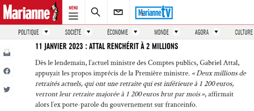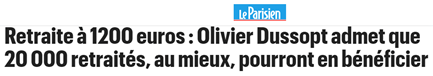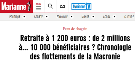 Du « pas une retraite en dessous de 1200 € » initial, le nombre de bénéficiaires du minimum retraite est passé à 2 millions, puis à 200 000, puis à 40 000, pour finir entre 10 000 et 20 000 maximum[i][ii][iii][iv] ! Quelle honte !