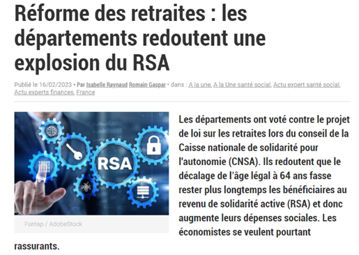Le report de deux ans de l’âge de départ à la retraite devrait se traduire par près de 100 000 chômeurs de 60 ans et plus[i] et par une explosion du nombre de bénéficiaires du RSA, ce qui grèverait le budget des Conseils départementaux[ii].