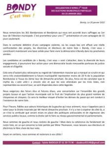 Dans le contexte délétère d’une campagne violente, où les coups bas ont effacé une réelle confrontation des projets, les électrices et électeurs de notre liste « Bondy, c’est vous » constituent maintenant une base solide pour faire vivre la démocratie à Bondy dans les prochaines années.