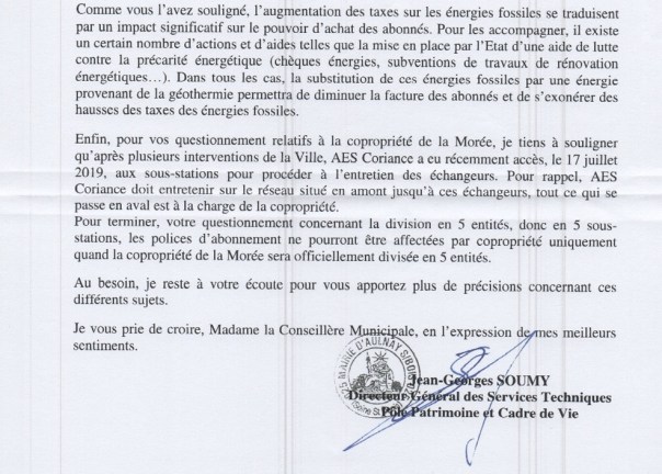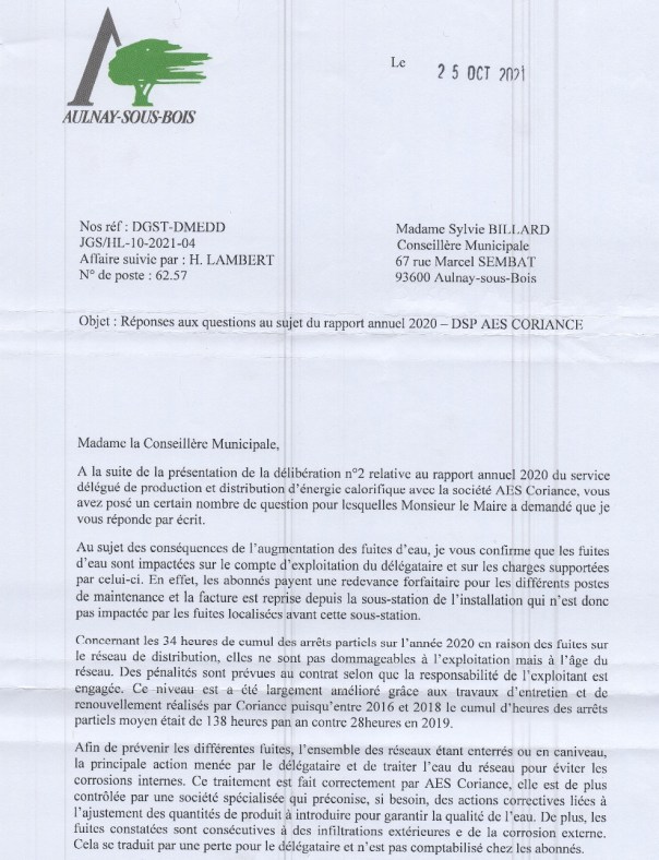 Je vous transfère ci-dessous les réponses de la mairie suite aux questions relatives à la délibération n°2 sur l’activité du service de production et de distribution d’énergie calorifique lors du Conseil Municipal du 6 octobre dernier.