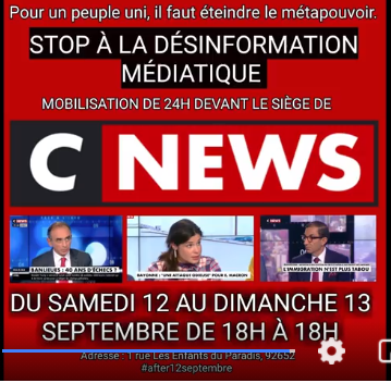 Le leader charismatique du mouvement La Révolution Est En Marche donne rendez-vous à ses troupes le samedi 12 septembre devant les locaux de la chaîne CNEWS. Objectif : prendre position devant les locaux pour 24h.